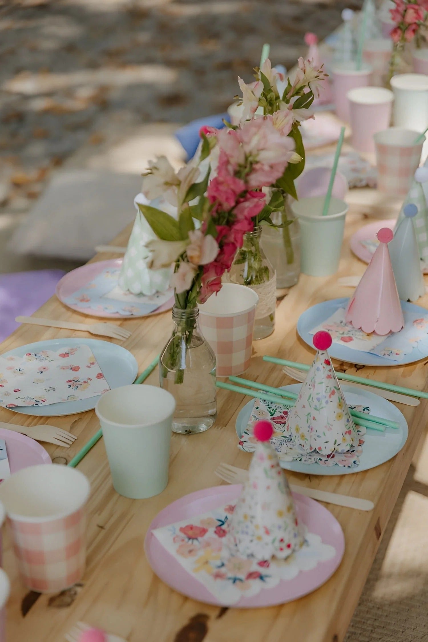 A vibrant party setup featuring playful pastel tones and whimsical details. This table is styled with colorful plates, matching cups, and festive confetti, creating a cheerful celebration mood. The candy-striped lollipop and fun party blower add a touch of sweetness and charm, making it perfect for birthdays or any joyful occasion.