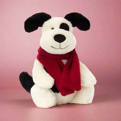 Get ready for cozy cuddles with the Bashful Winter Puppy. This adorable plush dog has soft cream fur with rich black patches, a suedette nose, and floppy fold ears. Dressed in a removable berry knit scarf, this sweet pup is perfect for winter adventures, playtime fun, or as a thoughtful gift for children and dog lovers alike.