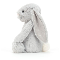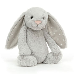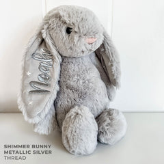 This shimmer bunny plush toy is a soft and comforting companion designed to bring a touch of magic to bedtime. With glimmery grey fur, floppy ears lined with silver star patterns, and a sweet pink nose, this bunny makes an adorable friend for children and a charming addition to any nursery or playroom.