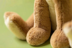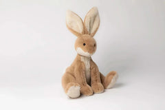 This hare plush toy is a cuddly companion made with soft biscuit-brown fur, an oatmeal-colored tummy and paws, and a flat cream tail. Its large back feet and long ears give it a realistic, huggable design, making it a sweet addition to any soft toy collection.
