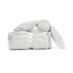 Bring comfort and charm to your little one with this Plush Bunny Blankie, crafted from luxuriously soft silver-grey fur made using recycled fibres. Designed with long floppy ears, a pink suedette nose, embroidered eyes, and squashy paws, this adorable bunny holds a silky-soft blanket that provides endless cuddles and warmth.